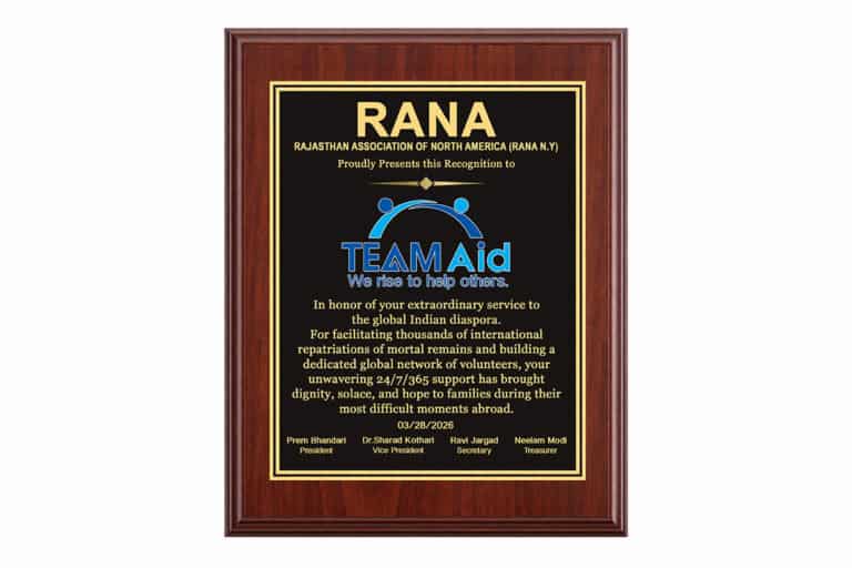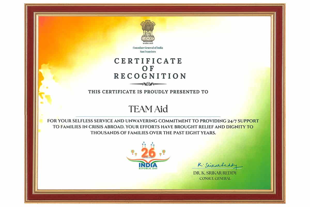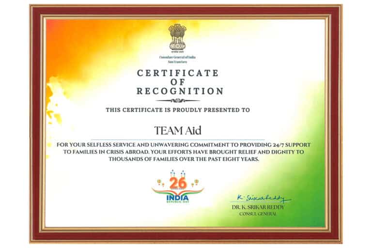 SAN FRANCISCO, CA — On the occasion of India’s Republic Day, TEAM Aid was deeply honored to receive a Certificate of Recognition from the Consulate